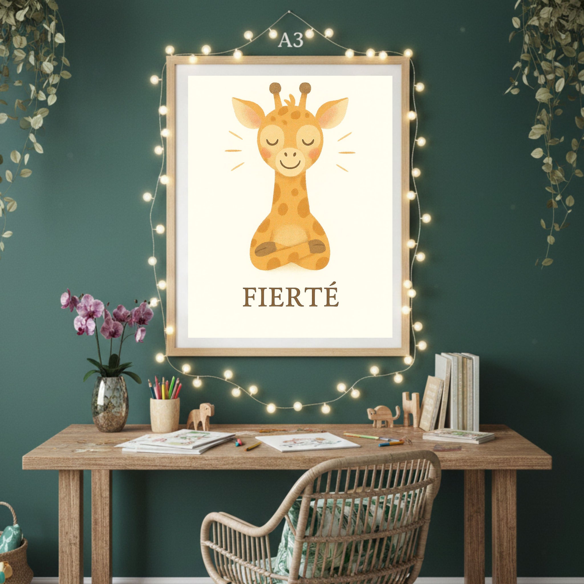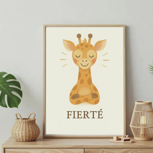 Cette girafe lumineuse incarne la fierté douce, celle qui naît quand un enfant ose, progresse, apprend et se dépasse à son rythme. Avec son regard bienveillant et sa posture élancée, elle invite votre enfant à reconnaître ses réussites, même les plus petites, et à développer une confiance intérieure solide et apaisée.