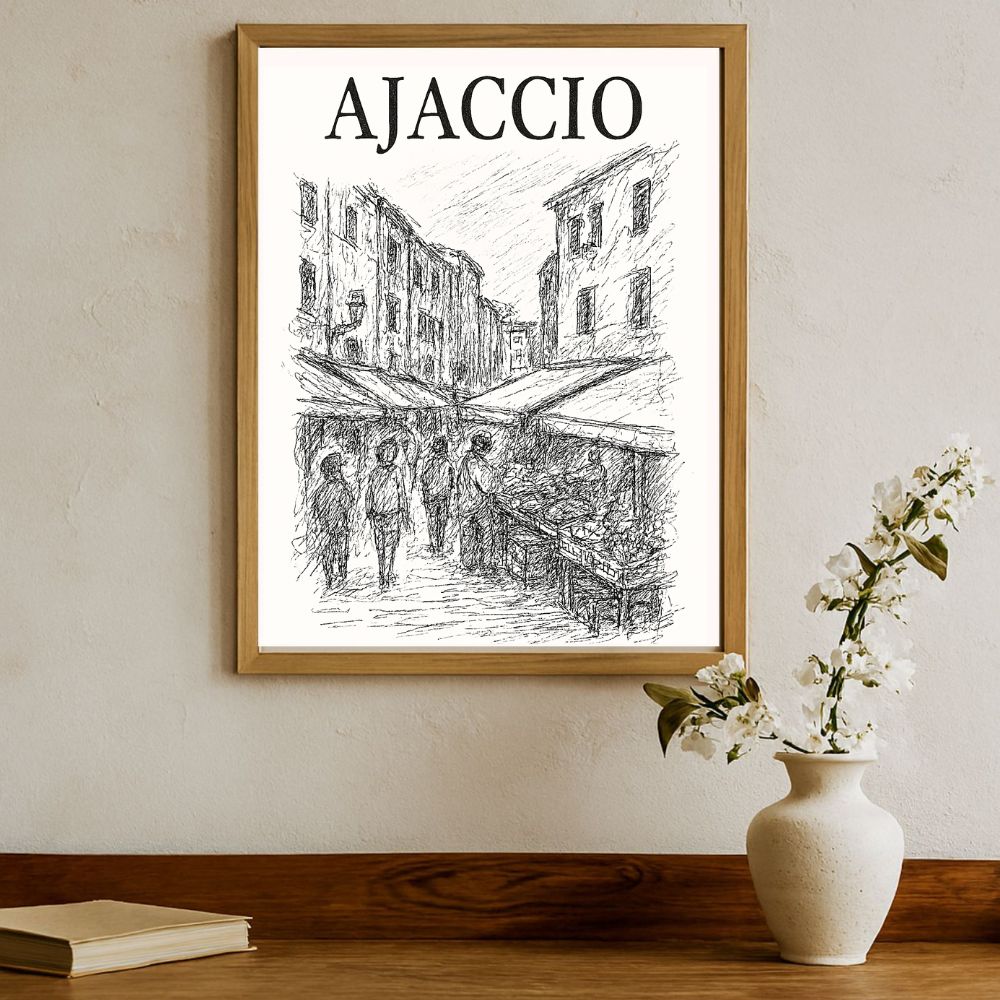 AJACCIO s’invite chez vous avec cette affiche numérique poétique et artistique. Un poster imprimable en haute résolution (300 dpi), représentant une scène typique corse en style croquis noir et blanc, avec l’inscription élégante AJACCIO en police serif classique.