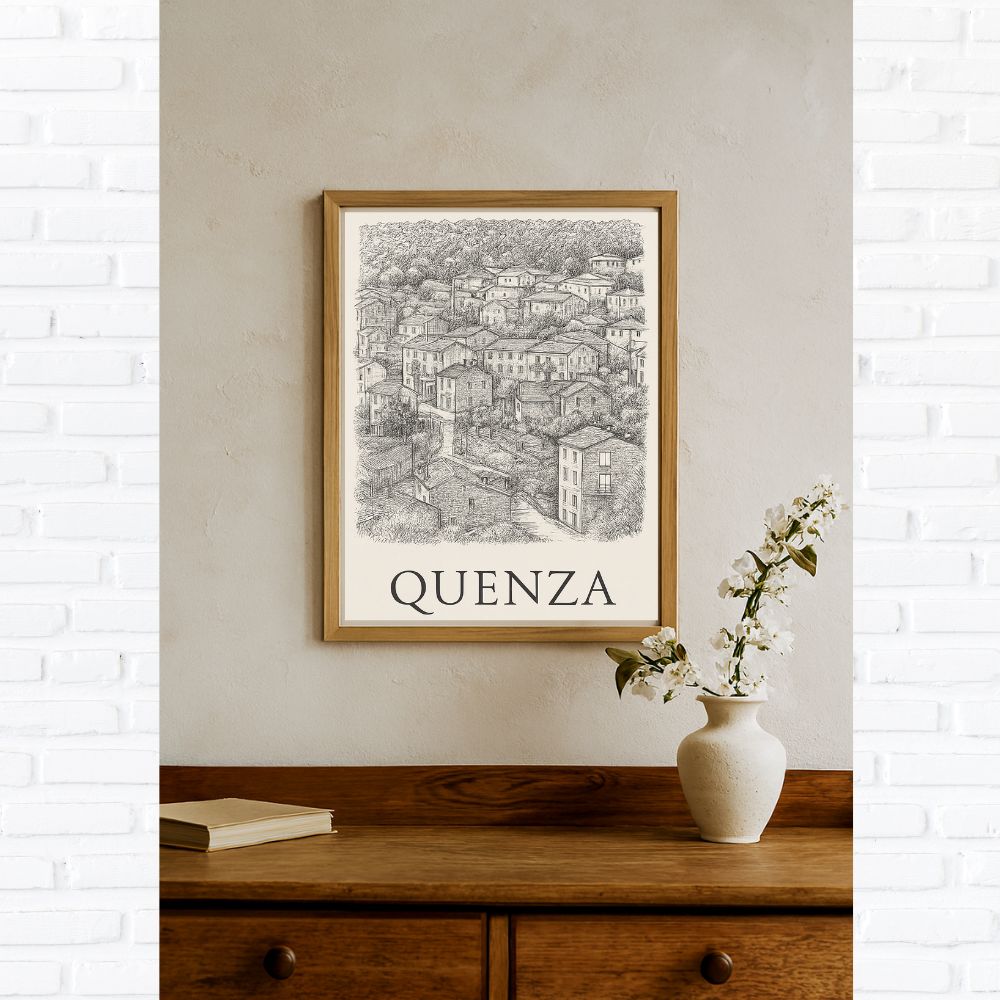 QUENZA s’invite chez vous avec cette affiche numérique poétique et artistique. Un poster imprimable en haute résolution (300 dpi), représentant une scène typique corse en style croquis noir et blanc, avec l’inscription élégante QUENZA en police serif classique.